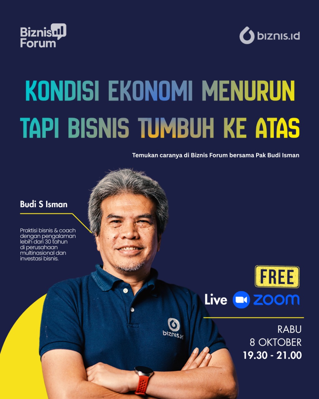 Temukan jawabannya langsung dari Budi S. Isman di Biznis Forum, sesi inspiratif GRATIS untuk para entrepreneur yang ingin tahu cara bertahan dan tumbuh di tengah tantangan ekonomi.